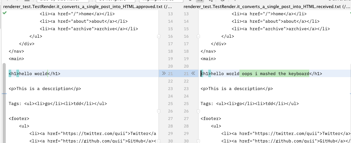Chạy lại bản kiểm thử của bạn. Một file "received" mới nên được tạo ra và bản kiểm thử sẽ thất bại. Hãy kiểm tra lại và nếu bạn hài lòng, hãy phê duyệt nó bằng cách sao chép nó qua phiên bản cũ. Chạy lại bản kiểm thử một lần nữa và nó sẽ vượt qua.