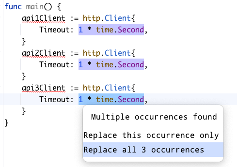 Chúng ta đang thiết lập một vài HTTP clients cho chương trình của mình. Đang có vài giá trị ma thuật ở đây, và chúng ta có thể DRY thuộc tính Timeout bằng cách trích xuất (extract) một biến mới và đặt cho nó một cái tên có nghĩa.